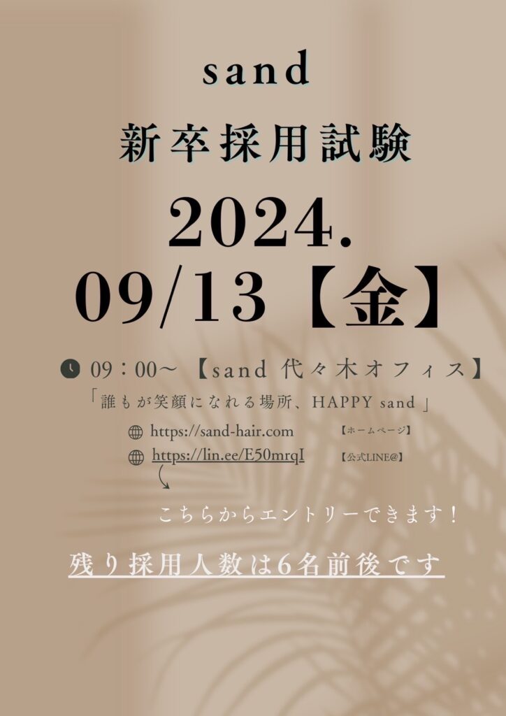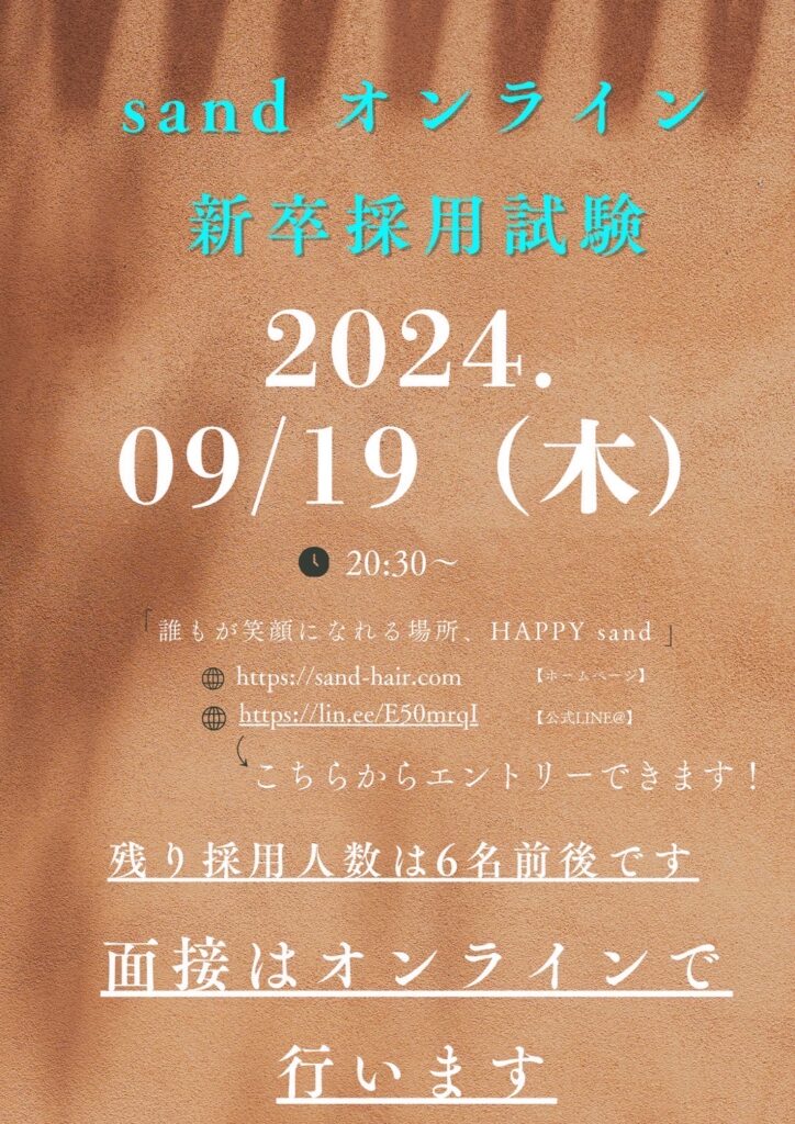 2024.9.4[9月] 関東 / 2025年度新卒採用【関東】2025年度新卒 会社説明会・採用試験のお知らせ⚫︎9/9(月) 10:00〜 会社説明会 @sand Ginza⚫︎9/13(金) 9:00〜 採用面接 @渋谷区代々木 ㅤ ⚫︎9/19(木) 20:30〜 採用面接 オンライン詳細は下記の画像をご確認ください。 ご応募、ご質問はLINEにて承っております。